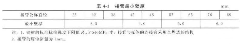 接管的厚度除要考慮上述要求外,還需考慮焊接方法、焊接參數、加工條件、施焊位置等制造上的因素及運輸、安裝中的剛性要求。